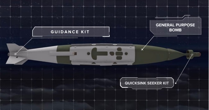 One of the truly intriguing developments in the field recently is the guidance kit for anti-ship bombs based on the successful J-DAM family. The bomb, called QUICKSINK, lives up to its name – it sinks a ship at an incredible speed. The bomb penetrates through the ship, detonates underneath it, and simply breaks it in half. The ship sinks within minutes, if not less.